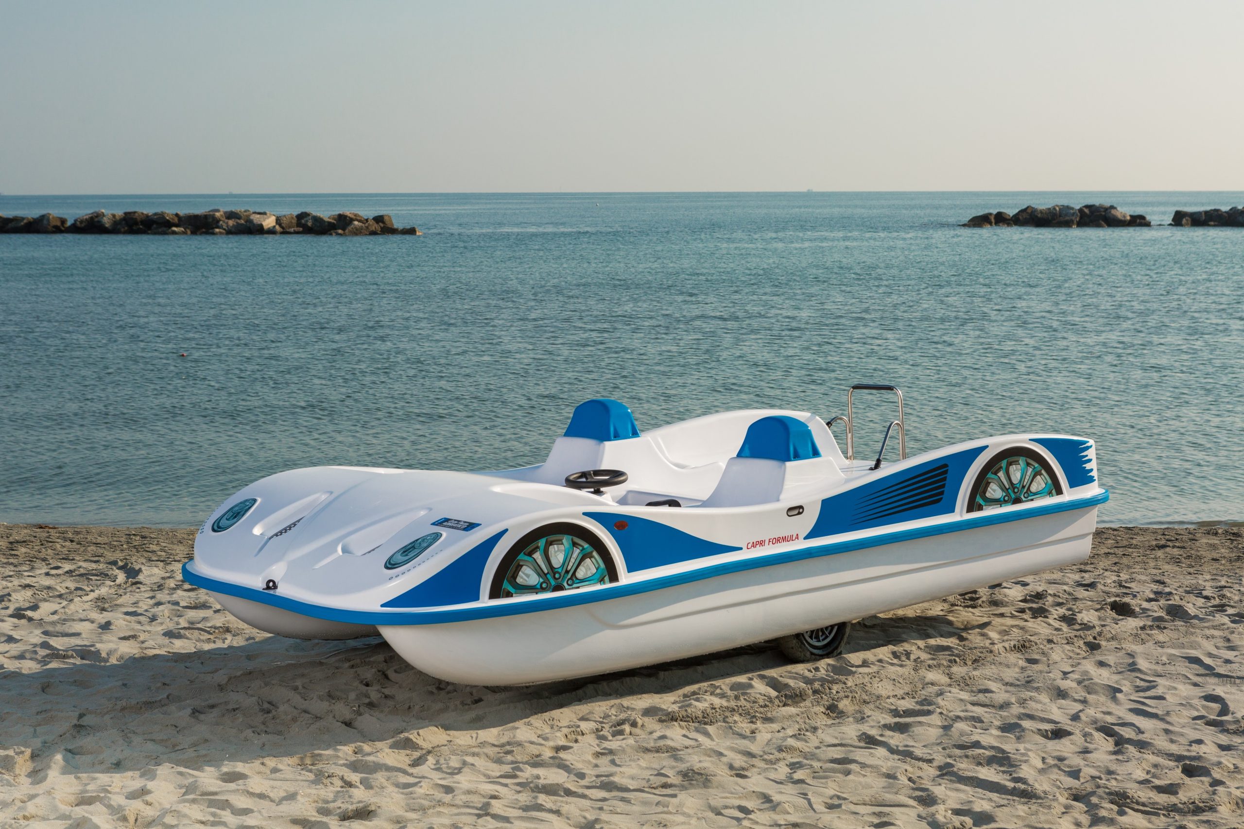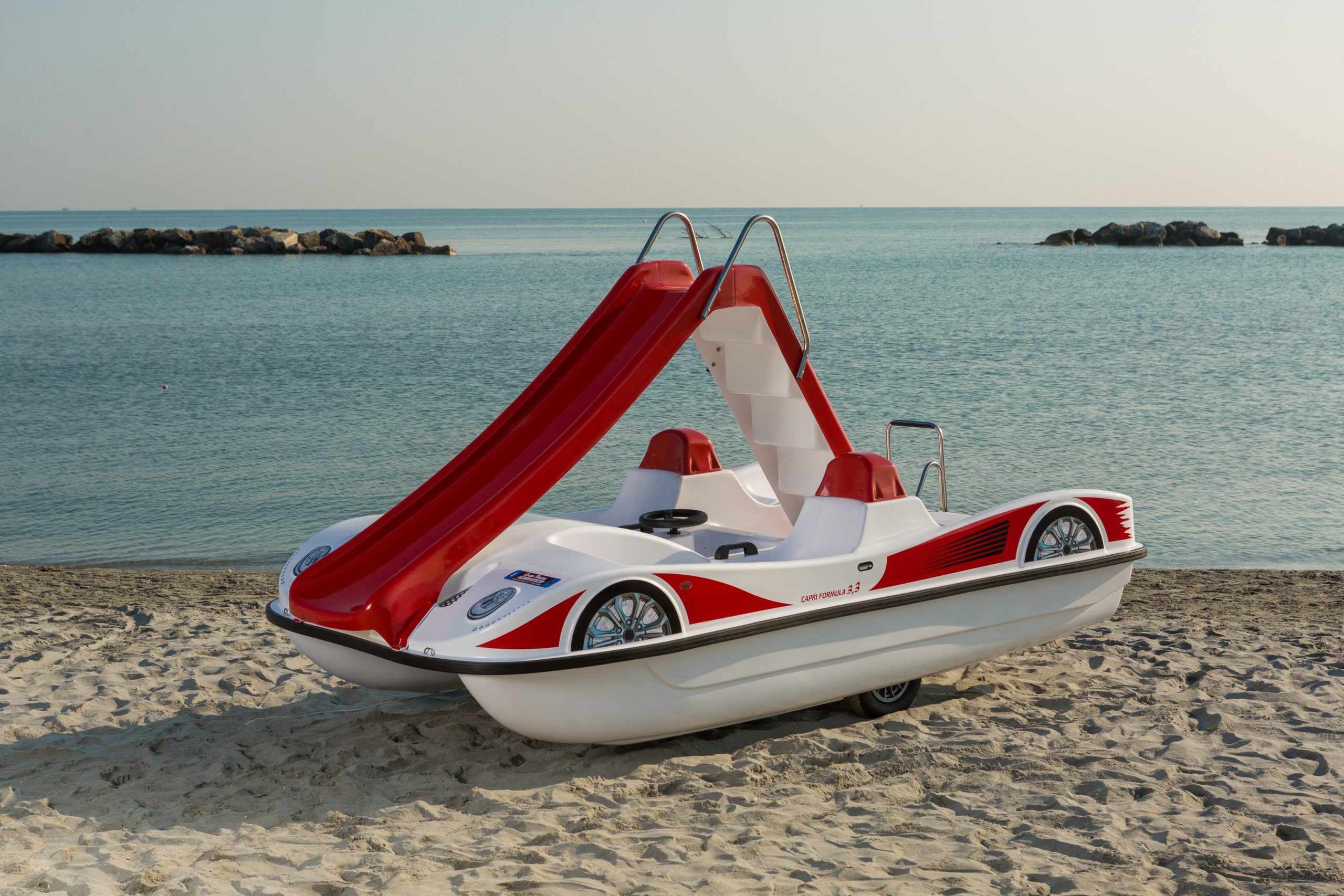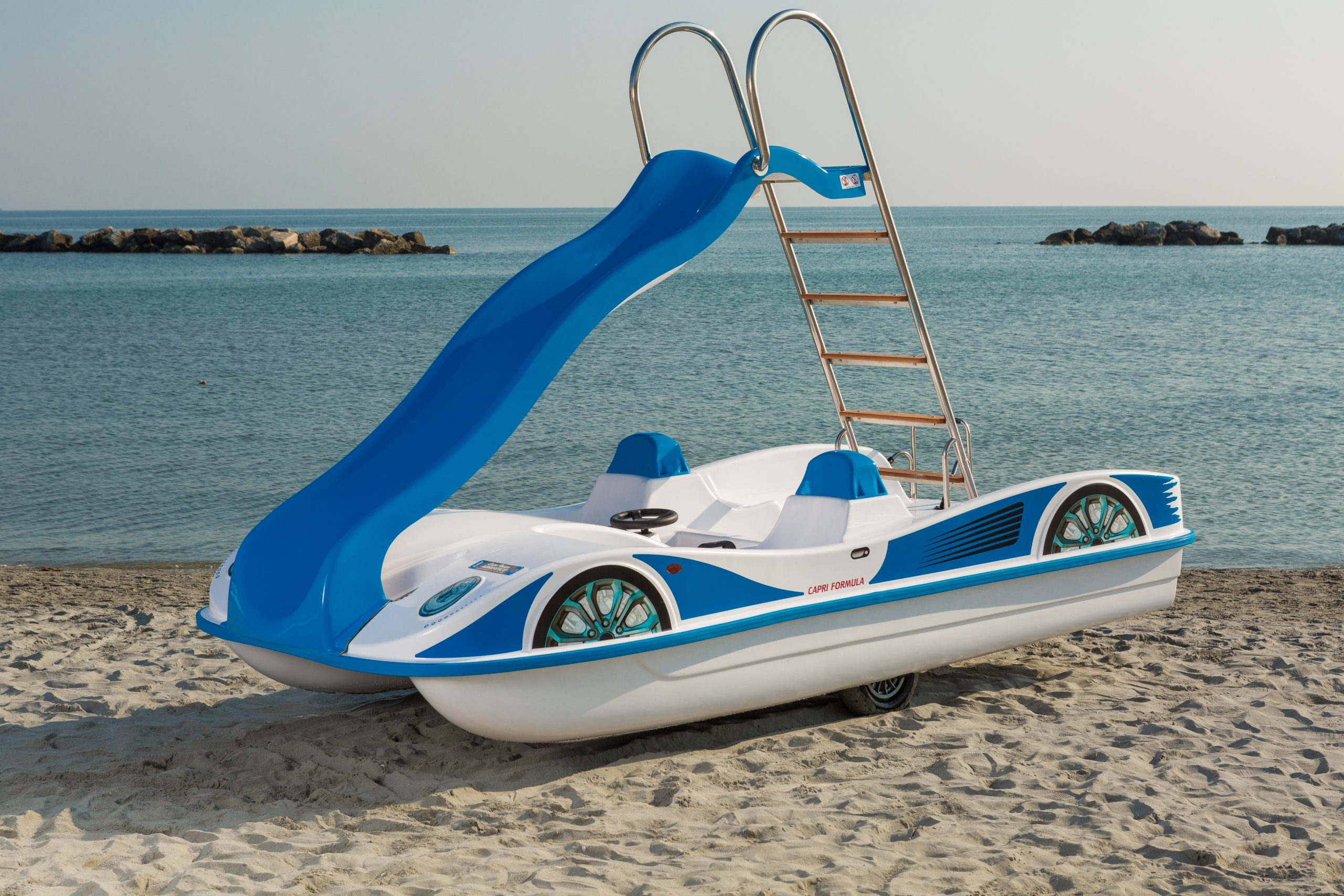 With all the features of Capri Formula, but more compact, this is the ideal pedalo for smaller spaces and beaches. Despite the smaller size, it can be fitted with a large slide at the bow for guaranteed fun....